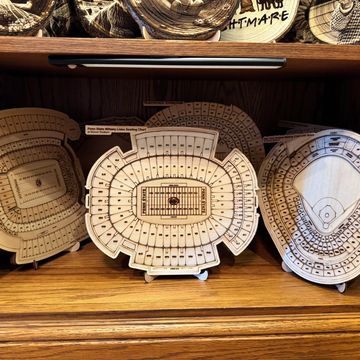 “I started off in 2022 with a curiosity about how lasers work with computers and quickly it moved from hobby to business. After figuring out how to make personal photos look 3D, things took off. I engrave 3D images on wood, stadiums based off seating charts for sports teams, and multi-layered skylines of cities with the sports stadiums on them. Seasonally, for Christmas, we do ornaments and ornament box sets as well as door hangers.”